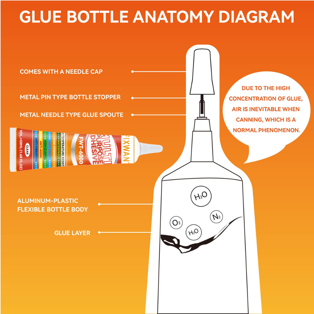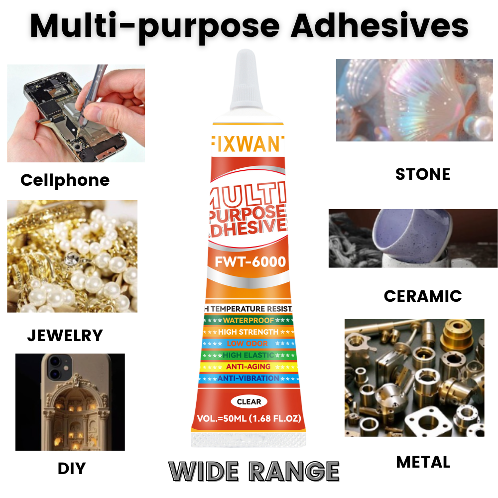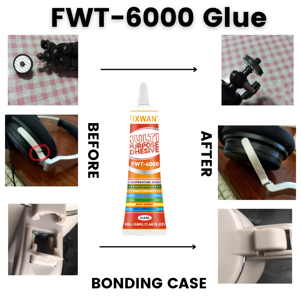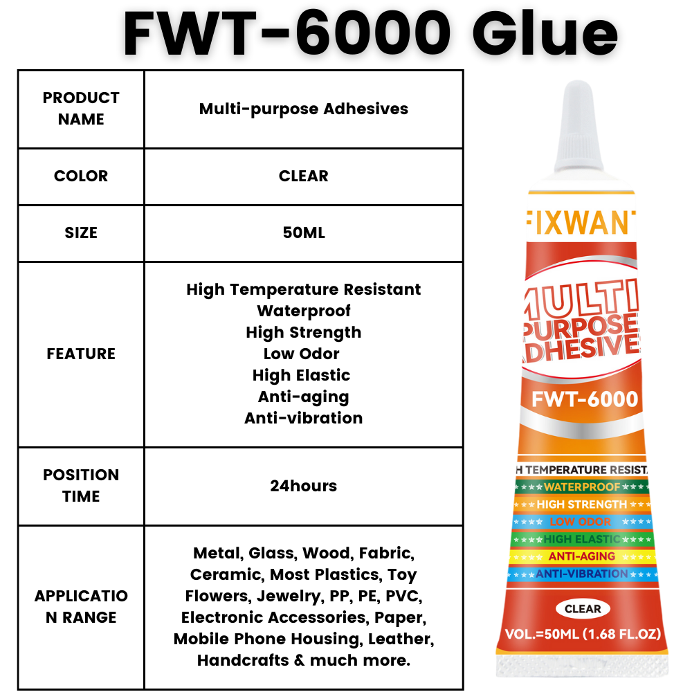 FIXWANT FWT-6000 is clear color glue, it can stick many materials: Metal, Glass, Wood, Fabric, Ceramic, Most Plastics, Toy Flowers, Jewelry, PP, PE, PVC, Electronic Accessories, Paper, Mobile Phone Housing, Leather, Handcrafts & much more. It can withstand 120°C high temperature intermittently.