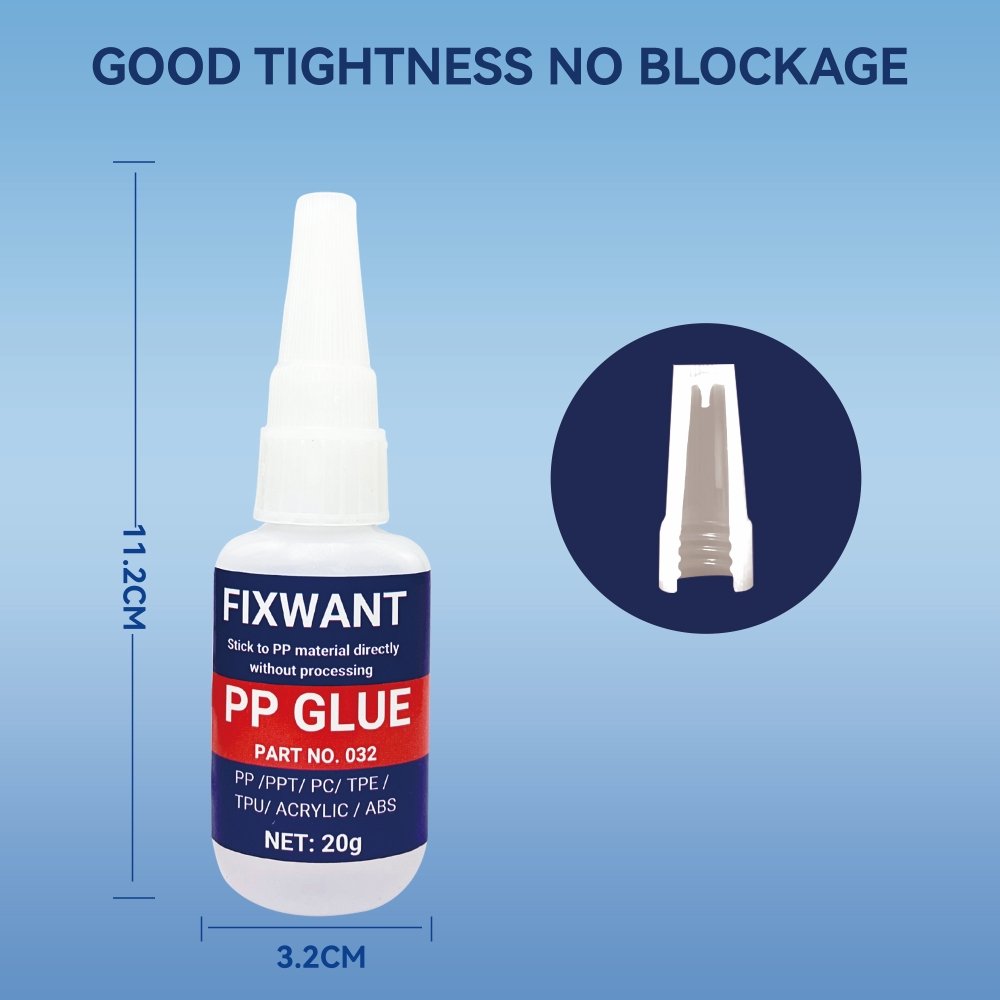FIXWANT PP GLUE is made for PP materials,PP/PPT/PC/TPE/TPU/ACRYLIC/ABS.Stick to PP material directly without processing and dry in seconds.