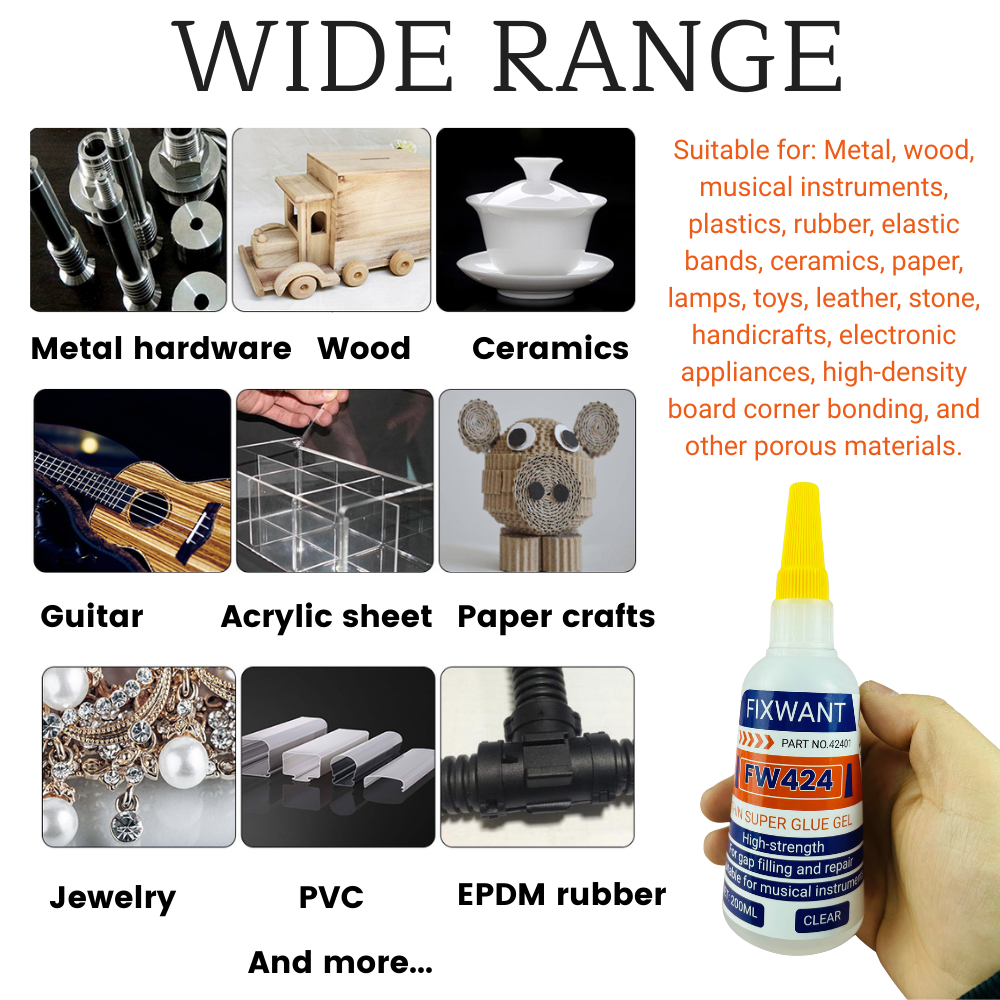 Suitable for: Metal, wood, musical instruments, plastics, rubber, elastic bands, ceramics, paper, lamps, toys, leather, stone, handicrafts, electronic appliances, high-density board corner bonding, and other porous materials.