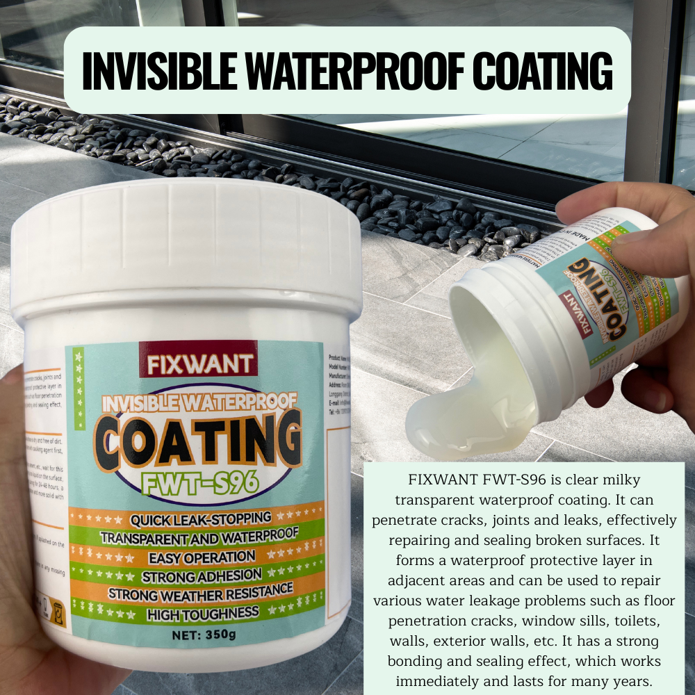 FIXWANT FWT-S96 is clear milkytransparent waterproof coating. It canpenetrate cracks, joints and leaks,effectively repairing and sealing brokensurfaces. It forms a waterproofprotective layer in adjacent areas andcan be used to repair various waterleakage problems such as floorpenetration cracks, window sills, toiletswalls, exterior walls, etc. It has a strongbonding and sealing effect, which worksimmediately and lasts for many years.